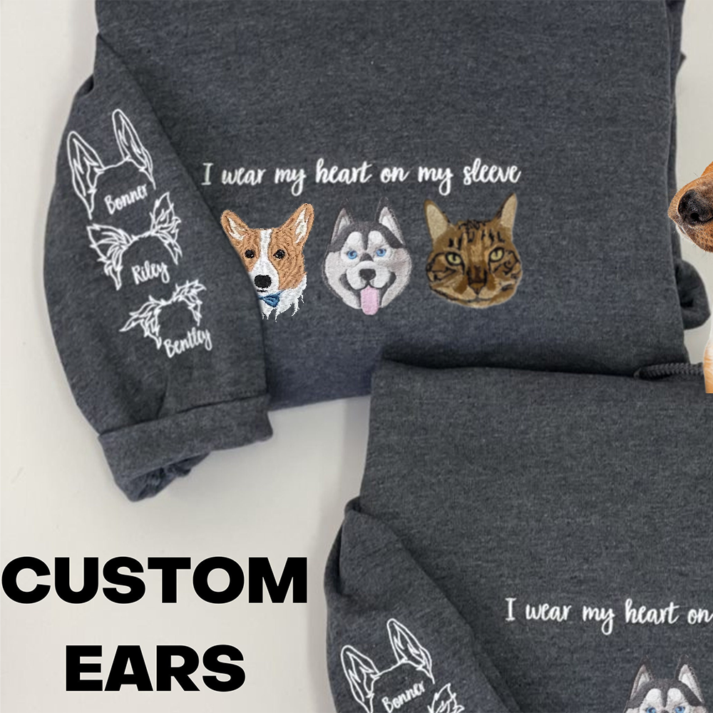 I Wear my Heart on my Sleeve Embroidered Sweatshirt Custom Pet Portrait Embroidered Hoodie