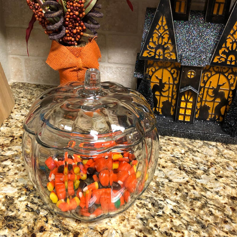 This pumpkin glass jar can store the candies received on Halloween. Decorating it at home can add to the festive atmosphere of Halloween. The glass material lets you see the candies inside and is easy to wipe clean.