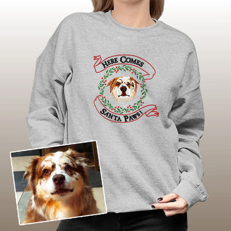 Here Comes Santa Paws Christmas Personalized Pet Portrait Embroidered Hoodie Sweatshirt T-shirt