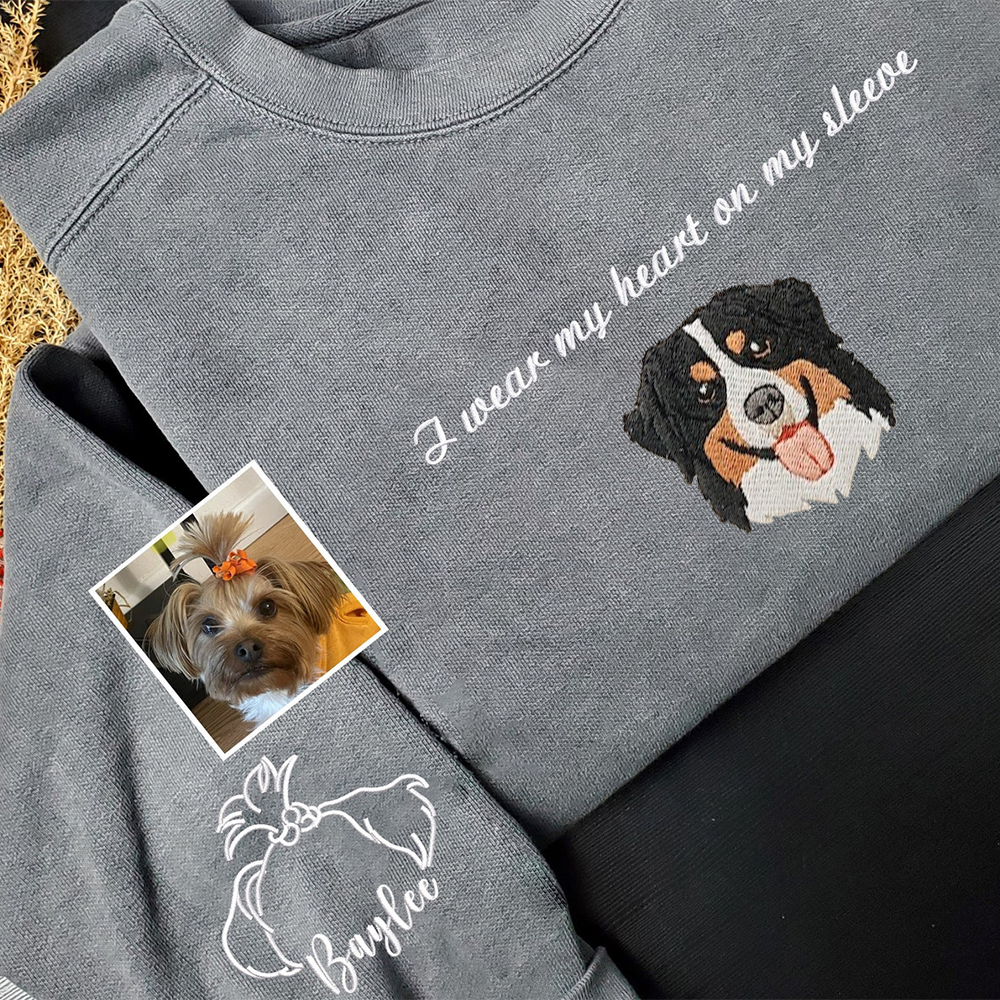 I Wear my Heart on my Sleeve Embroidered Sweatshirt Custom Pet Portrait Embroidered Hoodie