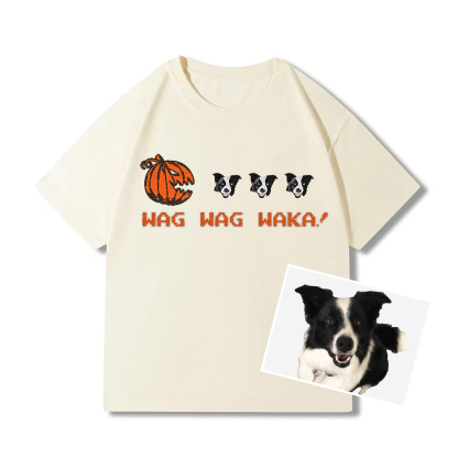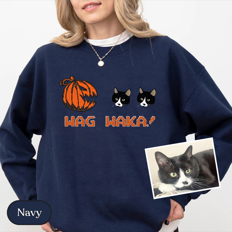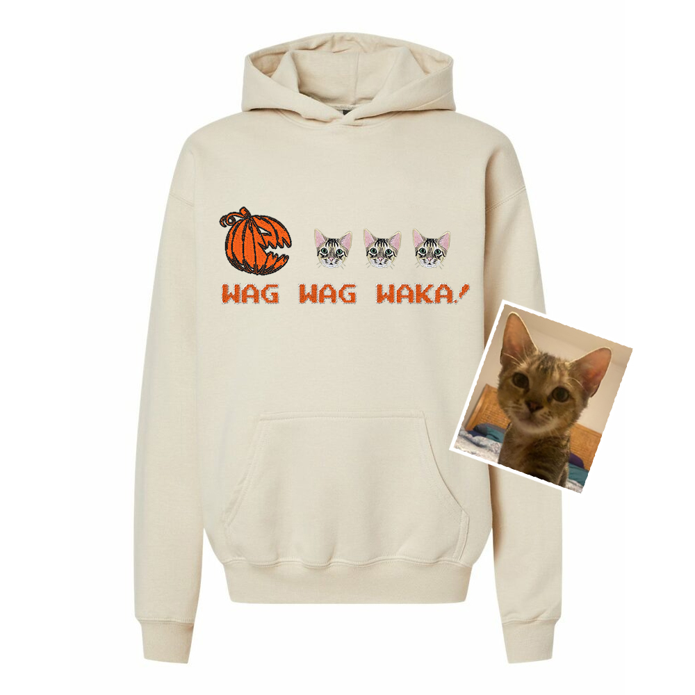 Get your pet in the Halloween spirit with our Wag Wag Waka! collection. This unique design features your pet’s custom embroidered portrait inside a Halloween pumpkin, perfect for those who love both their pets and the spooky season. Available as a T-shirt, sweatshirt, or hoodie, this piece is ideal for trick-or-treating or cozying up at home with your furry friend!